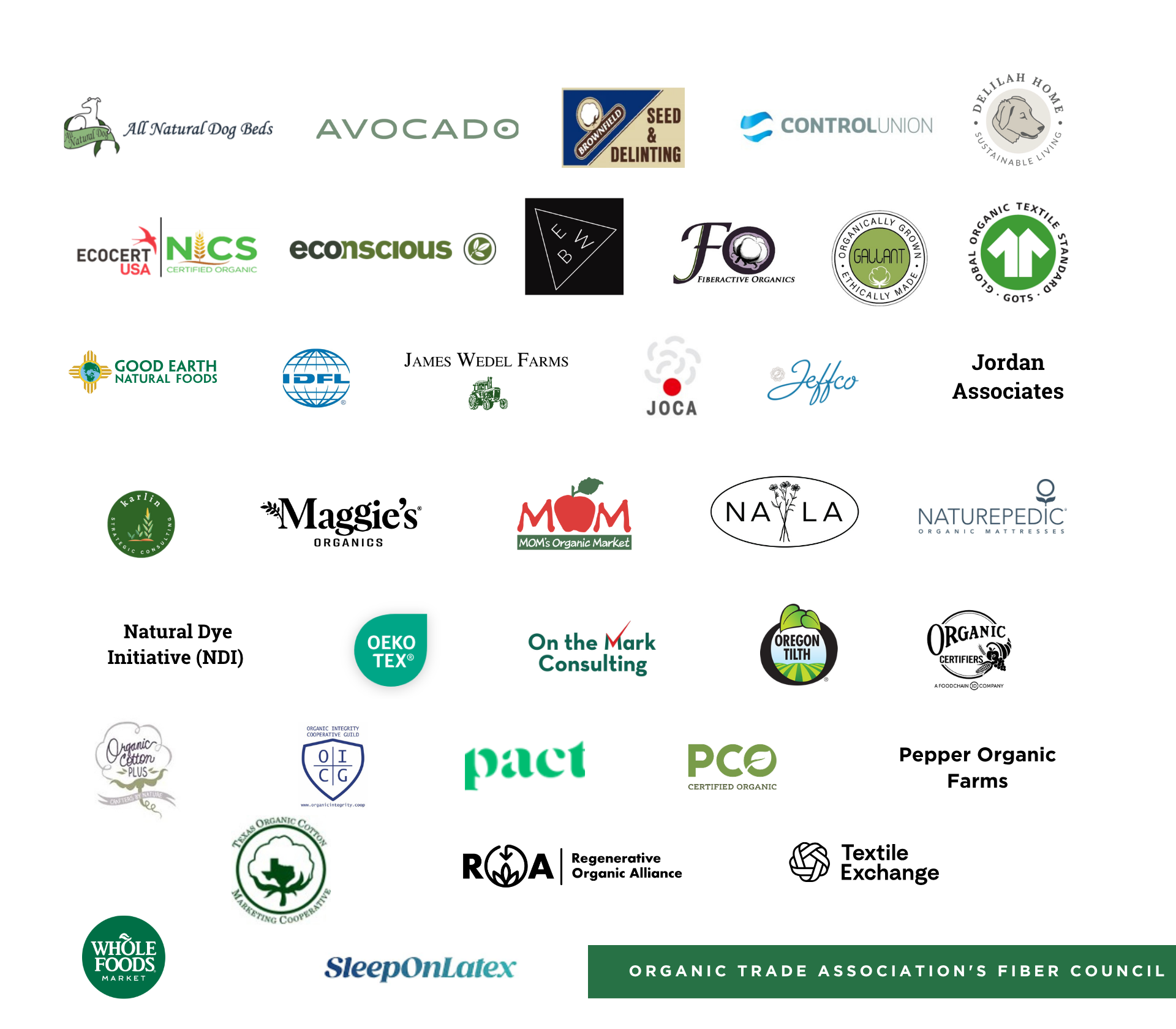 Over 40 Organic Trade Association member companies which represent the organic fiber supply chain, from farmers to manufacturers, certifiers, researchers, retailers and more, from wool and cotton clothing companies to organic mattress retailing currently participate on the Fiber Council.