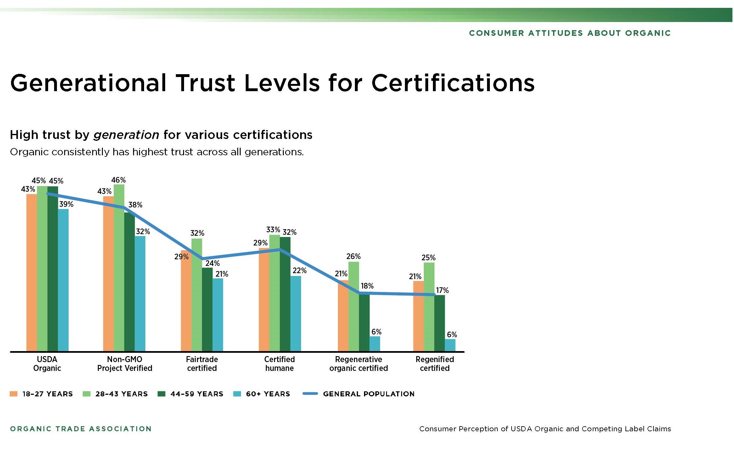 The results showed that not only do members of the Millennial and Gen Z generations buy the most organic, but that the USDA Organic label garners the deepest trust from consumers of all ages and is synonymous with health in the minds of most shoppers. Organic’s benefits to personal health outrank its benefits to environmental health in purchase decisions, especially with younger consumers, and the sometimes-higher prices of organic products are not an obstacle to those health-conscious individuals.