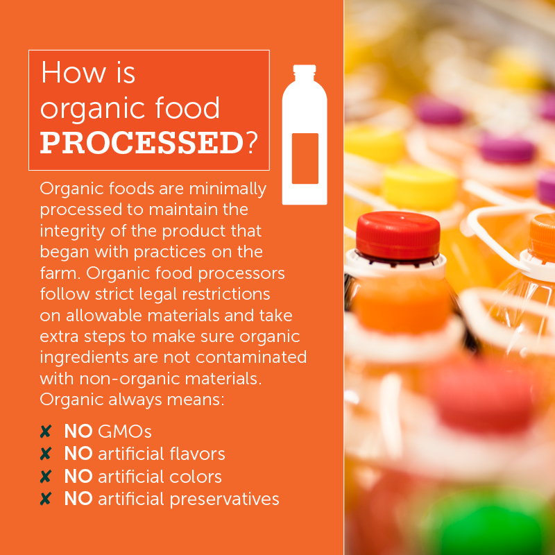 Organic food must be processed in an operation that has been certified to organic standards, with special steps taken to make sure the organic ingredients are not co-mingled or contaminated with non-organic materials.