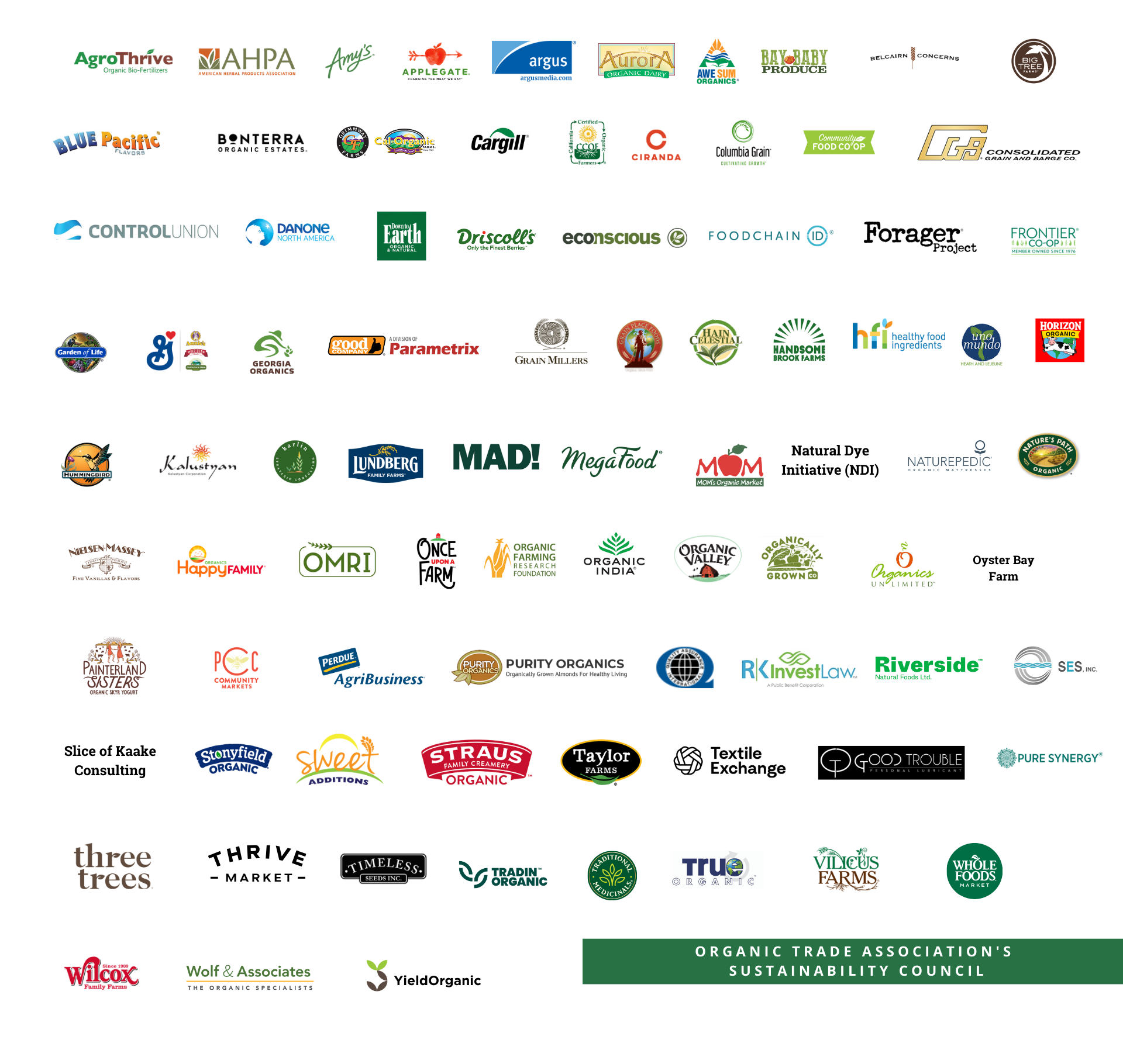 Nearly 100 Organic Trade Association member companies currently participate in the Sustainability Council. They represent the full organic supply chain, including producers, processors, retailers, consultants, industry partners, and more.